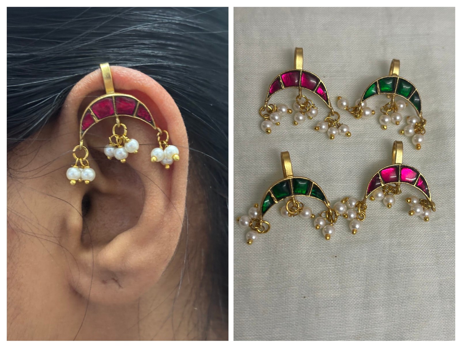 This product features a set of handcrafted half-moon shaped ear cuffs, each meticulously designed with a 22kt gold-plated finish. The ear cuffs are characterized by their distinct crescent shape, showcasing a vibrant enamel inlay in alternating colors of deep pink/magenta and emerald green. The enamel is framed by a delicate gold-plated border, highlighting the rich colors. Dangling from the lower curve of the half-moon are clusters of small, round pearl-like beads, connected by fine gold-plated chains. These beads add a touch of elegance and movement to the design. The ear cuffs are designed with a small loop at the top for secure attachment, suggesting they could be used as part of a larger earring design or as individual ear embellishments.