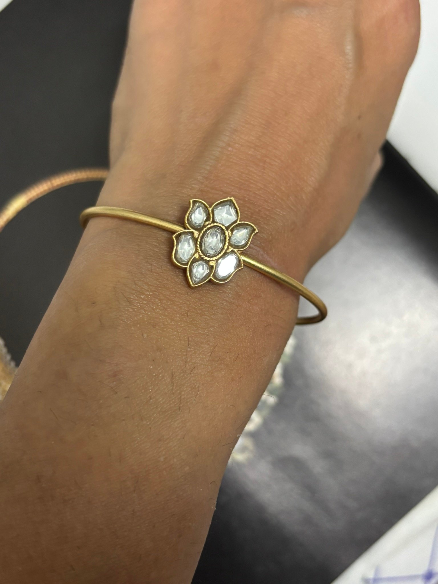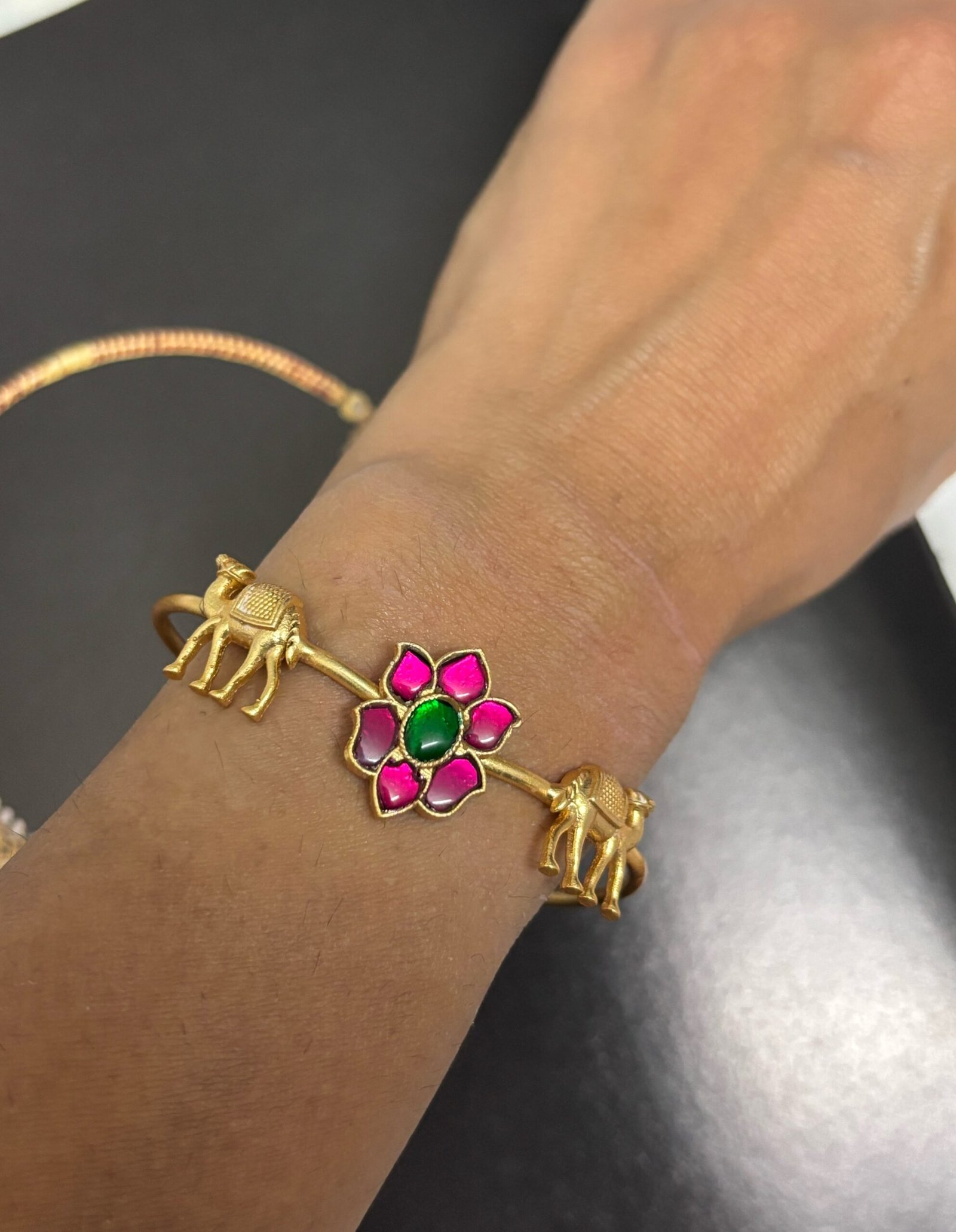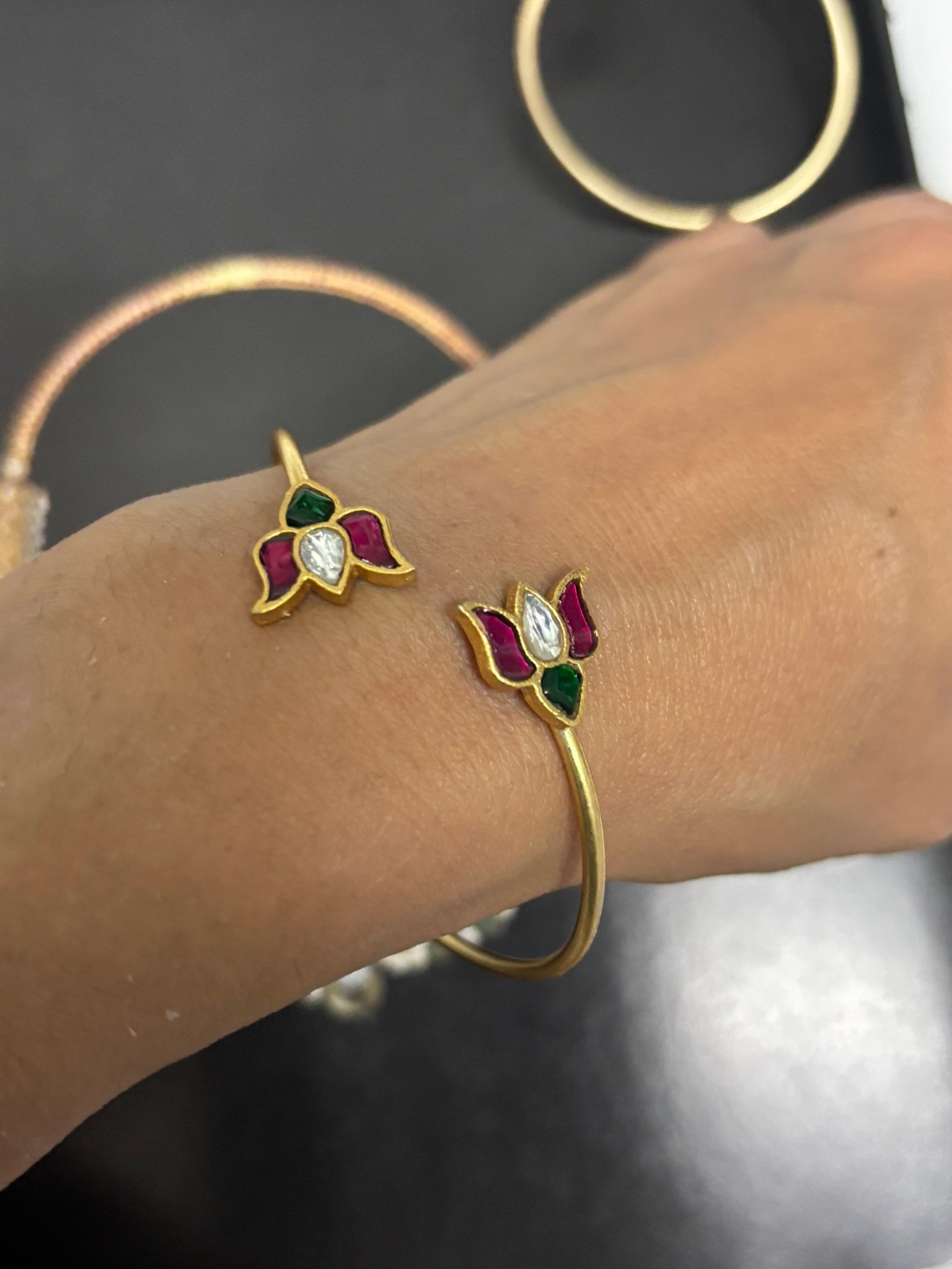 This collection presents an array of handcrafted hand cuffs, each meticulously fashioned from brass and finished with a luxurious 22kt gold plating. These cuffs feature a thin, open-ended band design, intended for comfortable wrist wear, and are distinguished by their unique decorative motifs. The designs encompass stylized deer figures flanking floral arrangements adorned with colored stones and pearl-like beads, delicate tulip-shaped elements, and singular floral pieces with central clear stones and pearl embellishments. Each cuff, a testament to artisanal skill, showcases intricate detailing and offers a blend of traditional inspiration with contemporary aesthetic. Ideal for adding a touch of distinct elegance to both casual and formal ensembles, these lightweight cuffs are designed for extended wear.