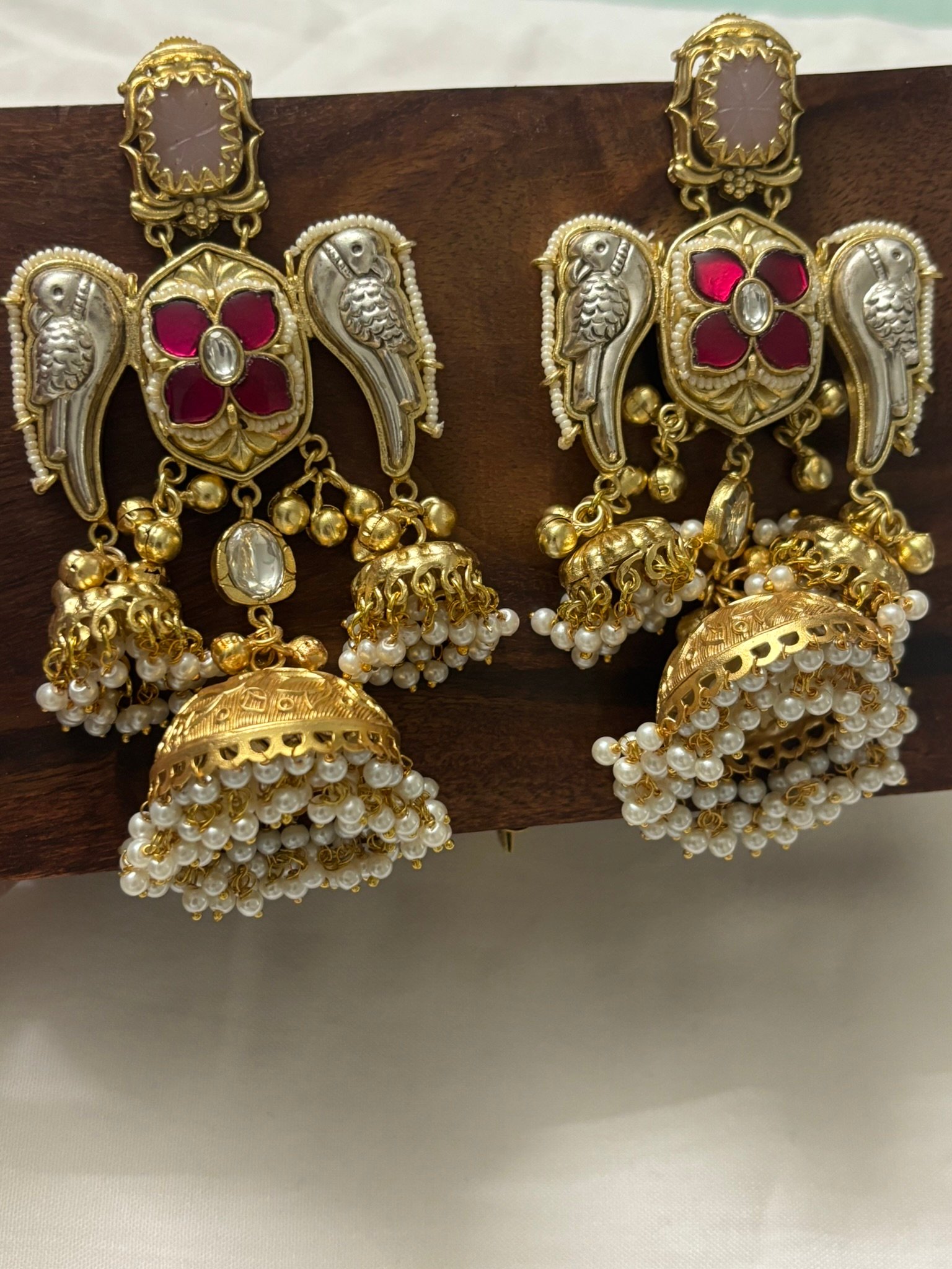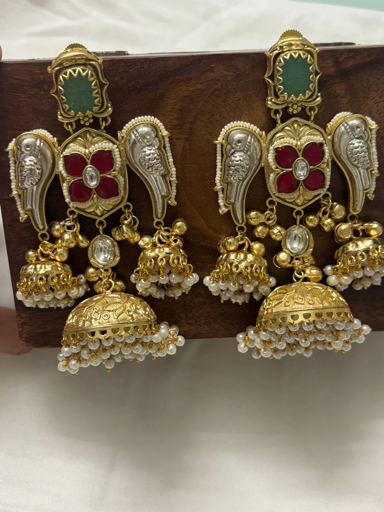 These are gold-plated long Jhumka earrings, featuring a multi-element design with a blend of traditional and contemporary influences. The earrings showcase a prominent Jhumka bell shape at the bottom, detailed with intricate gold-toned filigree and adorned with small, clustered pearl-like beads along the lower edge. Above the Jhumka, there’s a tiered structure: a larger, clear Monalisa stone set in a gold-toned base, followed by a stylized bird motif in a silver-toned finish with pearl-like bead accents. At the top, a floral design with colored stones (likely ruby or similar red) and pearl-like details is visible, capped by a green stone (possibly emerald or a similar green gemstone) set in a gold-toned frame. The earrings display a mix of textures and finishes, combining gold plating with silver-toned accents and pearl-like embellishments. The earrings are presented against a wooden surface, highlighting the intricate details and the contrasting colors.