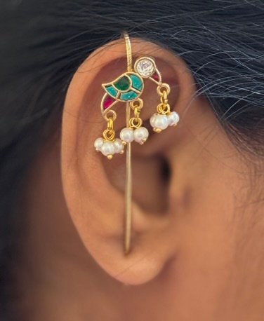 These are handcrafted parrot-shaped ear cuffs, crafted from brass with a 22kt gold-plated finish and embellished with Monalisa stones and pearl-like beads. The parrot-shaped design is enameled in shades of teal-green and ruby-red, showcasing vibrant colors and intricate detailing. The parrot’s eye is represented by a small, clear Monalisa stone, adding a touch of sparkle. Delicate pearl-like beads are arranged in clusters beneath the parrot, enhancing the elegant design. The ear cuffs feature a unique, elongated pin design, allowing for a comfortable and secure fit along the ear’s edge.